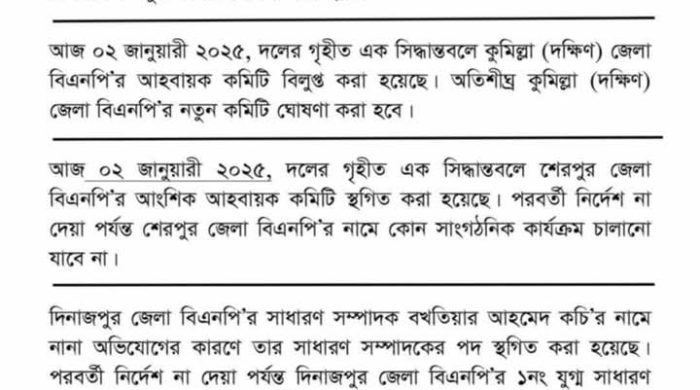 অ্যাডভোকেট রুহুল কবির রিজভী স্বাক্ষরিত বিএনপির প্যাডে উল্লেখ করা হয়- বৃহস্পতিবার (২ জানুয়ারী ২০২৫), দলের গৃহীত এক ‘সিদ্ধান্তবলে কুমিল্লা (দক্ষিণ) জেলা বিএনপি’র আহবায়ক কমিটি বিলুপ্ত করা হয়েছে। অতিশীঘ্র কুমিল্লা (দক্ষিণ) জেলা বিএনপি’র নতুন কমিটি ঘোষণা করা হবে।