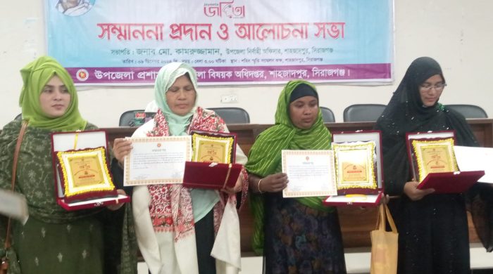 এ সময় অতিথিবৃন্দরা শাহজাদপুর উপজেলার চারজন নারীর জয়িতা কে সম্মাননা স্মারক ও ক্রেস্ট ও উপহার তুলে দেন ।