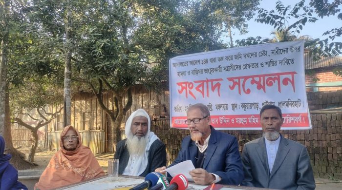 মঙ্গলবার (১৪ ডিসেম্বর) বিকেলে লালমনিরহাটের পাটগ্রাম উপজেলাধীন জগতবের ইউনিয়নের ২ নম্বর ওয়ার্ডের কচুয়ারপাড় এলাকার নিজ বাড়িতে এই সংবাদ সম্মেলনে লিখিত বক্তব্যে মরহুম আফতাব উদ্দিন ও মহিম উদ্দিন ওয়ারিশবর্গের পক্ষে সহকারী অধ্যাপক শফিকুল ইসলাম বলেন, আমরা ৫ ভাই ও আমাদের চাচা মরহুম মহিম উদ্দিনের নিজনামীয় স্থাবর-অস্থাবর সম্পত্তি ওয়ারিশগণের মধ্যে চুড়ান্তভাবে বন্টননামা শেষ পর্যায়ে গুছিয়ে এনেছি। এছাড়াও ক্রয়সূত্রে প্রাপ্ত হয়ে ৯৮ শতাংশ জমি দলিলমুলে ১৯৯০ সালের মাঠ জরিপে মো. রফিকুল ইসলাম, মো. শফিকুল ইসলাম, মো. রবিউল ইসলাম, মো. রেজাউল ইসলাম, মো. সফিউল ইসলাম ও ভগ্নিপতি মরহুম আলতাফ হোসেন খন্দকারের নামে বিআরএস রেকর্ডভূক্ত হয়। যার বিআরএস খতিয়ান নম্বর ৫৮০, দাগ ৪১০১ ও ৪১০৩। উক্ত জমি ক্রয়সূত্রে প্রাপ্ত হয়ে আমরা দীর্ঘদিন ধরে চাষাবাদ করে আসছি। কিন্তু চলতি ডিসেম্বর মাস থেকে সন্ত্রাসী মাহবুব রহমান নয়ন, রব্বু আলম, মাসুদ রানা, জাহিদুল ইসলামসহ কতিপয় ভাড়াটে সন্ত্রাসী সামসুল আলম ও মুক্তা বেগমের হুকুমে জোরপূর্বক দখলের চেষ্টা করে আসছিল। পারিবারিকভাবে বিষয়টি স্থানীয় গণ্যমান্য ব্যক্তিবর্গের মাধ্যমে মীমাংসায় ব্যর্থ হই। পরবর্তীতে শান্তি-শৃঙ্খলা বজায়ের জন্য ফৌজদারী দন্ডবিধির ১৪৪/১৪৫ ধারায় মামলা দায়ের করা হয়। কিন্তু ১৪৪ ভঙ্গ করে বেআইনীভাবে জবরদখলের চেষ্টা করে। সন্ত্রাসীদের লাঠির আঘাতে লাকী বেগমের দাঁত ভেঙে যায়। এবং আরও বেশ কয়েকজনকে গুরুতর জখম করা হয়। আহতরা পাটগ্রাম হাসপাতালে চিকিৎসাধীন রয়েছে বলে জানান তিনি।