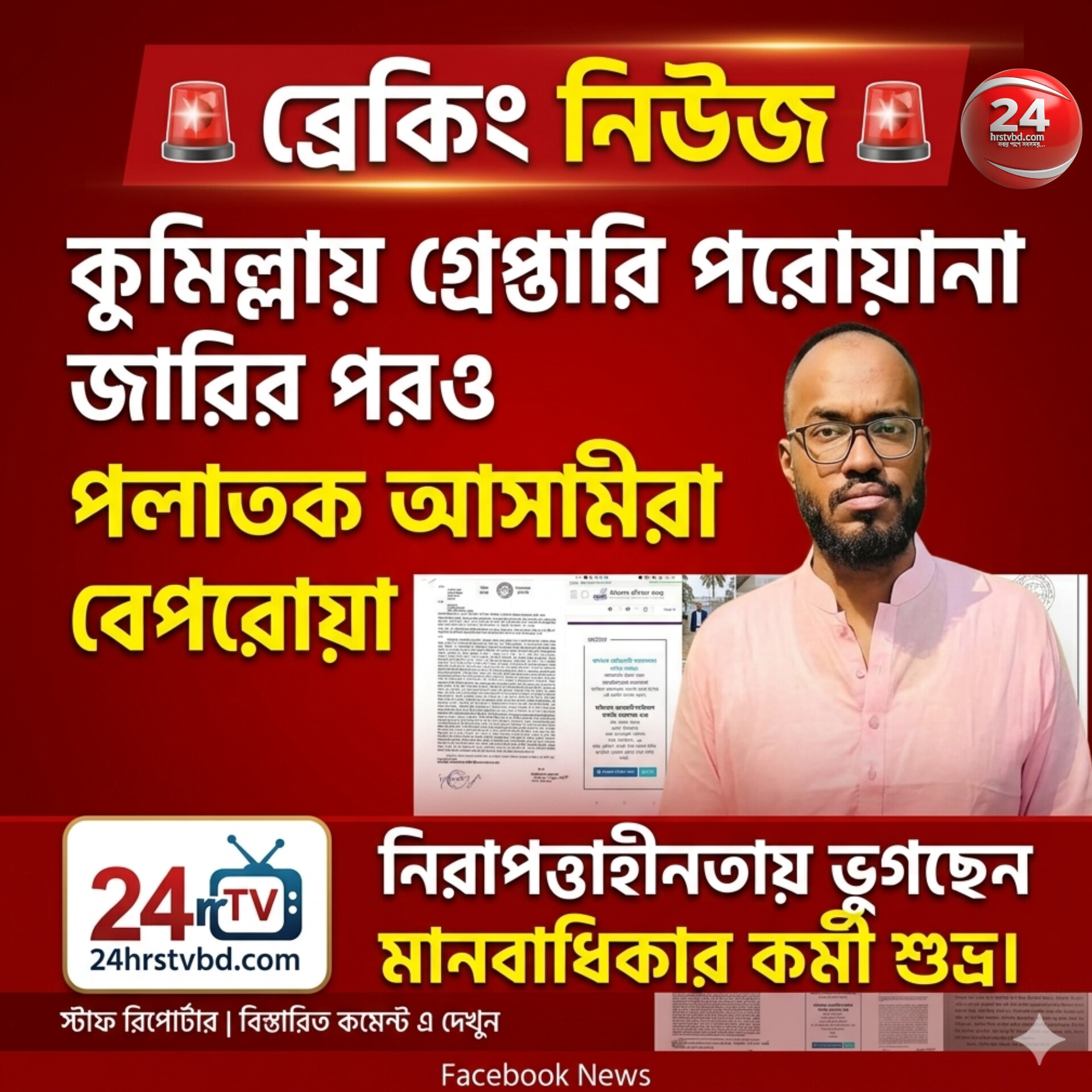 কুমিল্লায় গ্রেপ্তারি পরোয়ানা জারির পরও পলাতক আসামিরা বেপরোয়া, নিরাপত্তাহীনতায় ভুগছেন মানবাধিকার কর্মী শুভ্র।