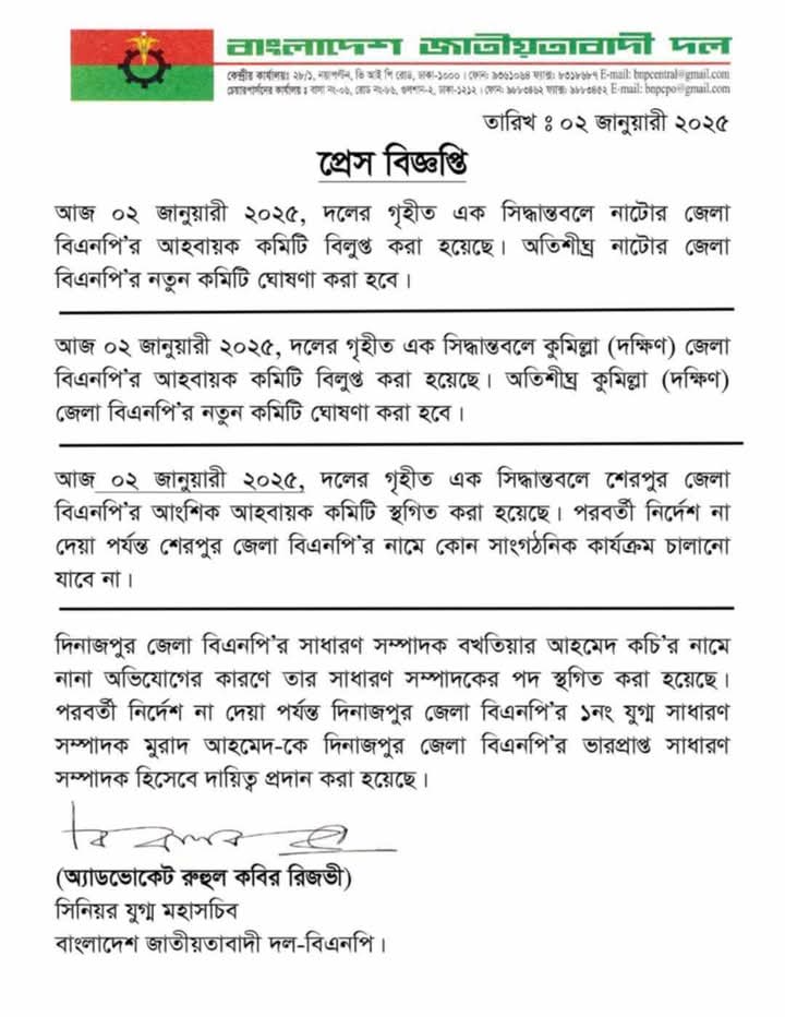 অ্যাডভোকেট রুহুল কবির রিজভী স্বাক্ষরিত বিএনপির প্যাডে উল্লেখ করা হয়- বৃহস্পতিবার (২ জানুয়ারী ২০২৫), দলের গৃহীত এক ‘সিদ্ধান্তবলে কুমিল্লা (দক্ষিণ) জেলা বিএনপি'র আহবায়ক কমিটি বিলুপ্ত করা হয়েছে। অতিশীঘ্র কুমিল্লা (দক্ষিণ) জেলা বিএনপি'র নতুন কমিটি ঘোষণা করা হবে।