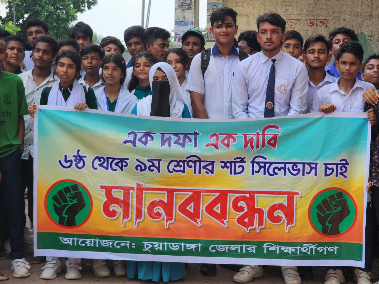 চুয়াডাঙ্গায় মানববন্ধন ও সড়ক অবরোধ করেছে ষষ্ঠ থেকে নবম শ্রেণীর শিক্ষার্থীরা।