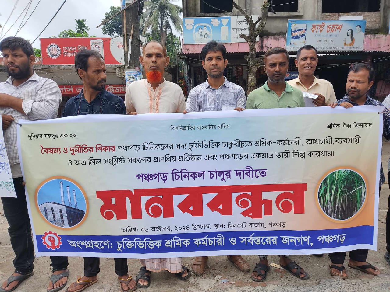 গত চার বছর ধরে বন্ধ হয়ে থাকা পঞ্চগড়ের একমাত্র ভারী শিল্প প্রতিষ্ঠান পঞ্চগড় চিনিকল চালুর দাবিতে বিক্ষোভ ও মানববন্ধন করেছে পঞ্চগড় চিনিকলের সদ্য চুক্তিভিত্তিক চাকুরীচ্যুত শ্রমিক-কর্মচারী, আখচাষী ও ব্যবসায়ীরা। এসময় তারা বৈষম্য ও দুর্নীতির শিকার হওয়ার নানা অভিযোগ তুলেন।