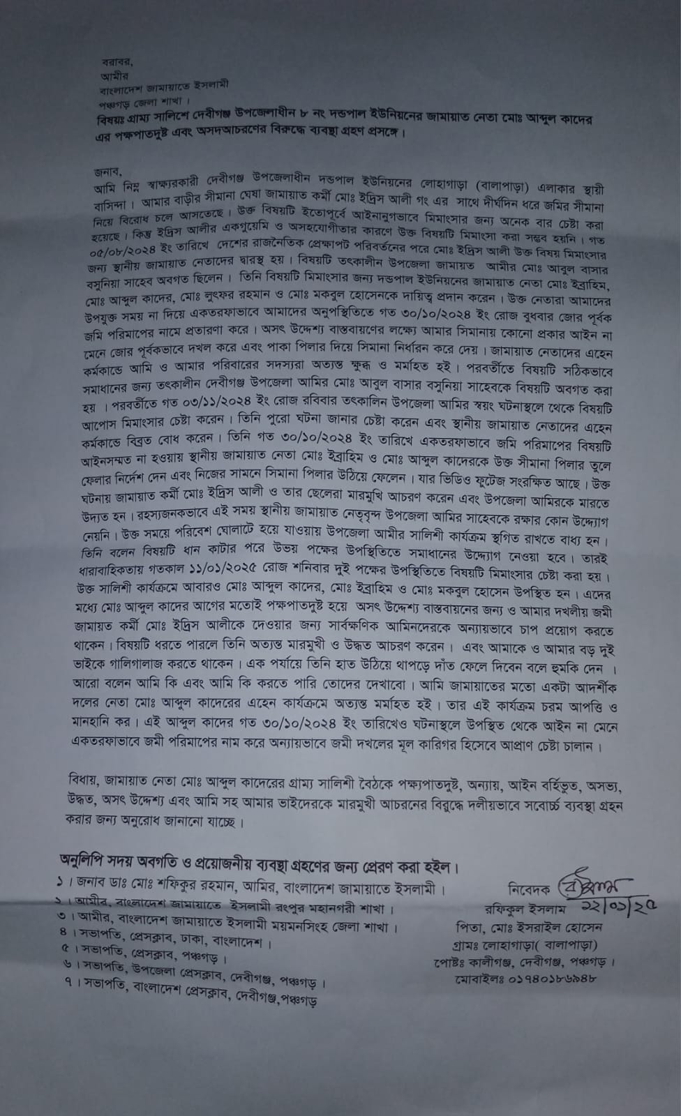 পঞ্চগড়ের দেবীগঞ্জ উপজেলার দন্ডপাল ইউনিয়ন জামায়াতের সহকারী আমির আব্দুল কাদের গ্রাম্য সালিশী বৈঠকে পক্ষ্যপাতদুষ্ট, অন্যায়, আইন বর্হিভূত, অসৎ উদ্দেশ্য, মারমুখী আচরন ও জমি দখলের অভিযোগ করেছে ভুক্তভোগী একটি পরিবার।রোববার (১২ জানুয়ারি)বাংলাদেশ জামায়াতে ইসলামী পঞ্চগড়ের জেলা আমির বরাবরে প্রতিকার ও আইনগত ব্যবস্থা গ্রহনে লিখিত অভিযোগ করেন,কালিগঞ্জ লোহাগাড়া এলাকার ইসরাইল হোসেনের ছেলে রফিকুল ইসলাম।
