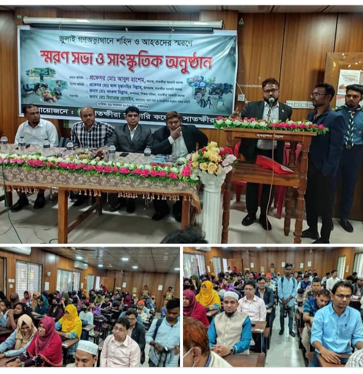 ২০২৪ এর জুলাই অভ্যুত্থানে শহীদদের স্মরণে আলোচনা সভা ও সাংস্কৃতিক অনুষ্ঠানের আয়োজন করেছে সাতক্ষীরা সরকারি কলেজ পরিবার।