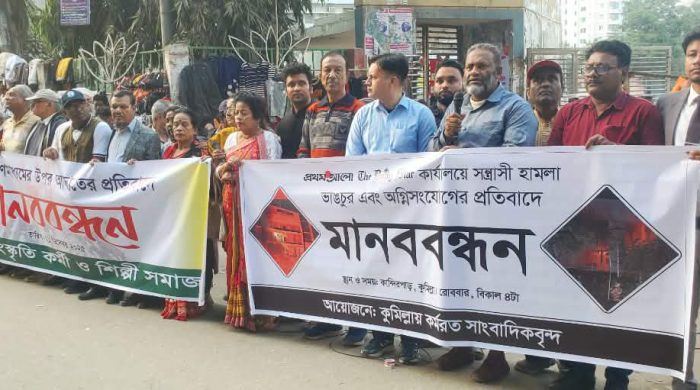 কুমিল্লায় প্রথম আলো ডেইলি ষ্টার সহ ছায়ানট ও উদিচিতে হামলার প্রতিবাদে মানববন্ধন