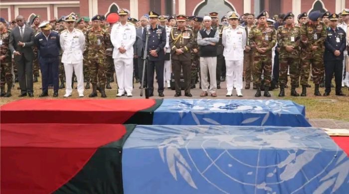 সুদানে জাতিসংঘ শান্তিরক্ষা মিশনে সন্ত্রাসী ড্রোন হামলায় শাহাদাতবরণকারী বাংলাদেশ সেনাবাহিনীর শান্তিরক্ষীদের নামাজে জানাযা অনুষ্ঠিত: যথাযথ রাষ্ট্রীয় মর্যাদায় শ্রদ্ধা নিবেদন।